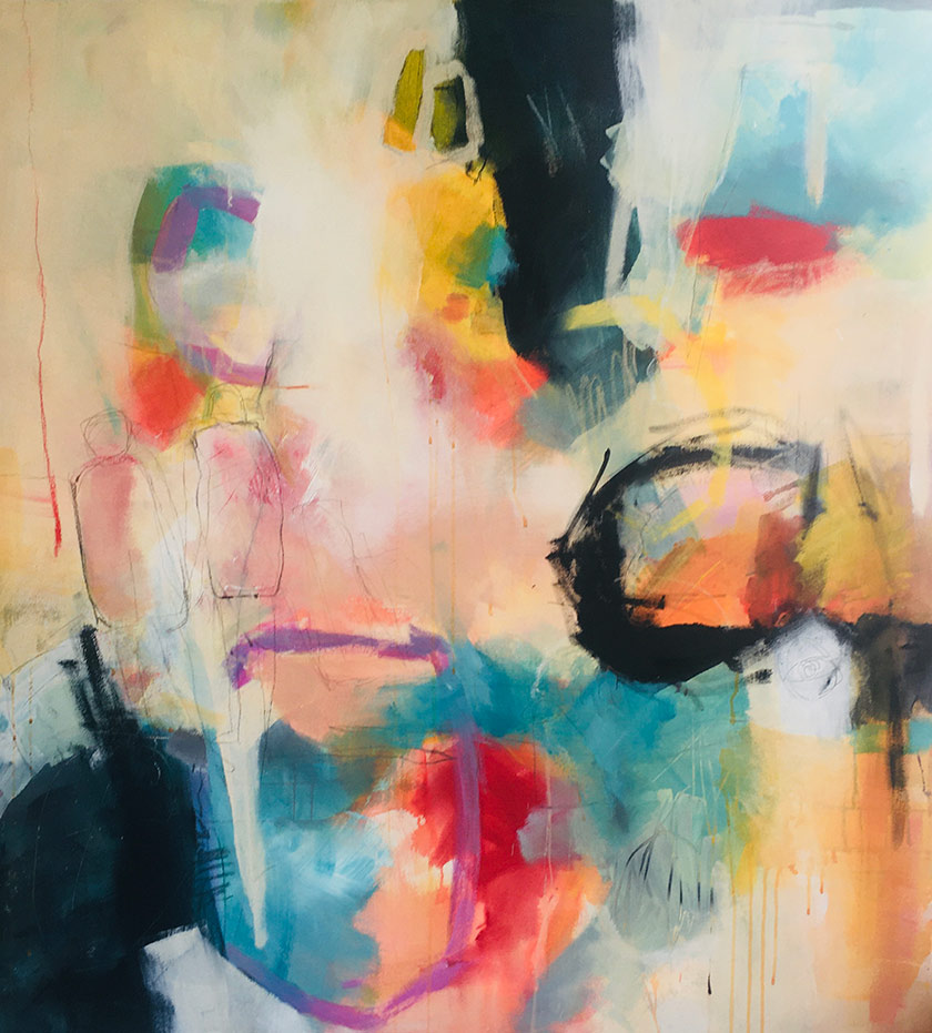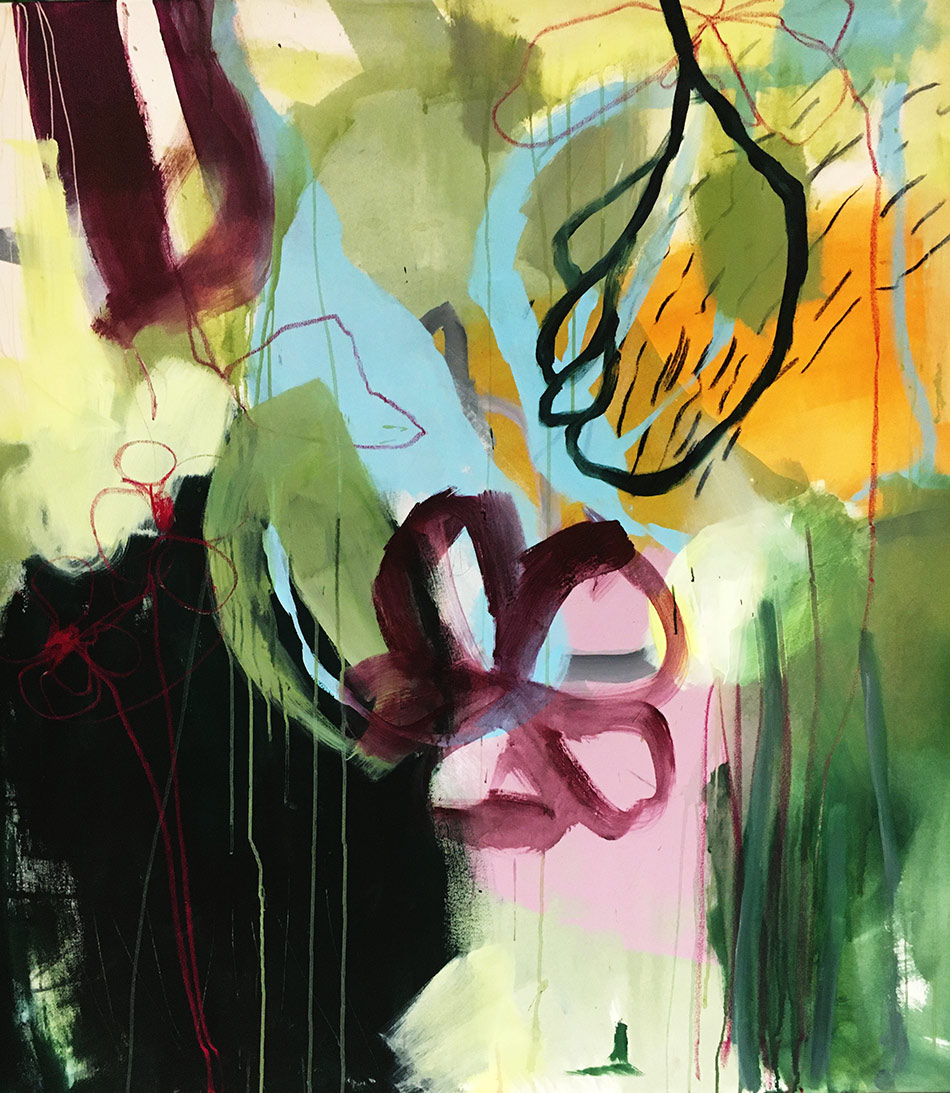 Die Werke von Marlene Tyroller entstehen intuitiv, die Titel der Arbeiten entwickeln sich im Laufe des Schaffensprozesses. Das Malen ist dabei ein äußerer wie innerer Prozess des Flows, des Stolperns, des Fragens, des Innehaltens, Weitergehens und letztendlich Findens.